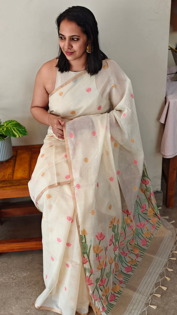 Linen blend saree with jamdani floral weaving