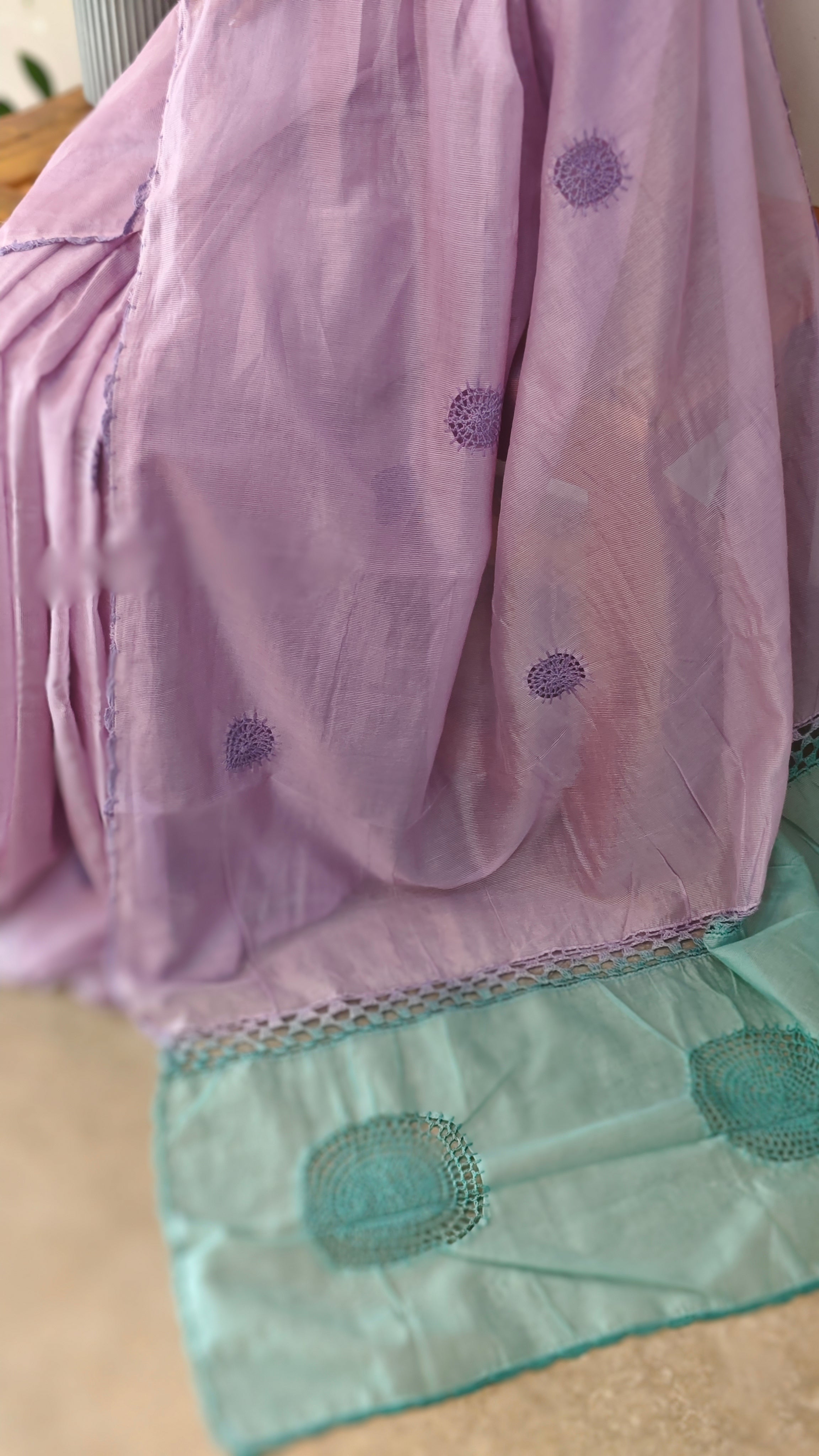 Net kota saree with crochet motifs spread across the saree with contrast pallu and bolder crochet motifs