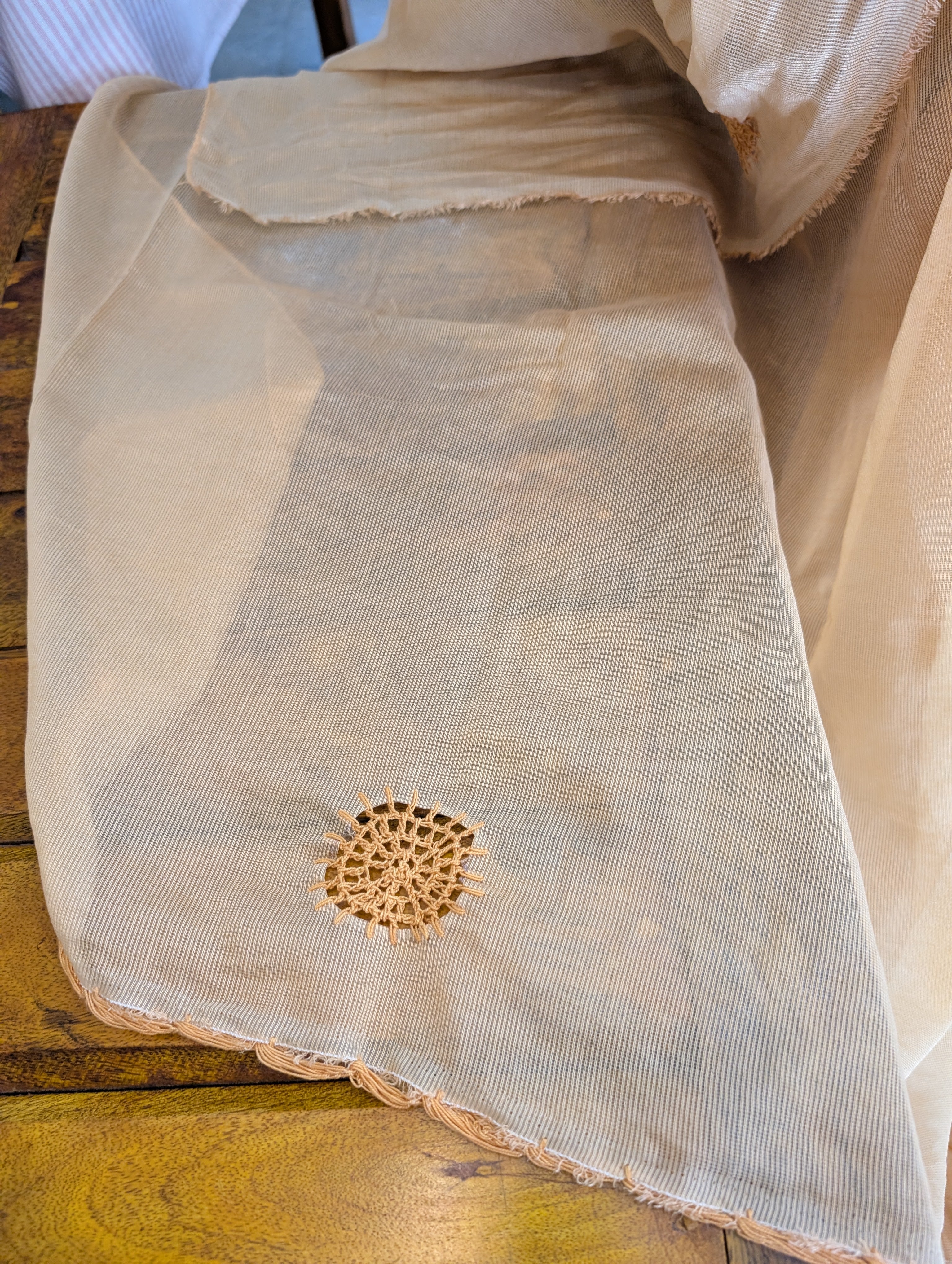 Same shade blouse piece as of the body with crochet motif for the sleeve