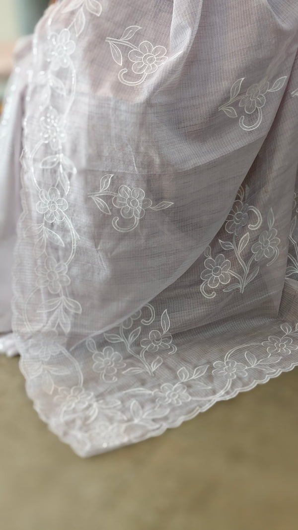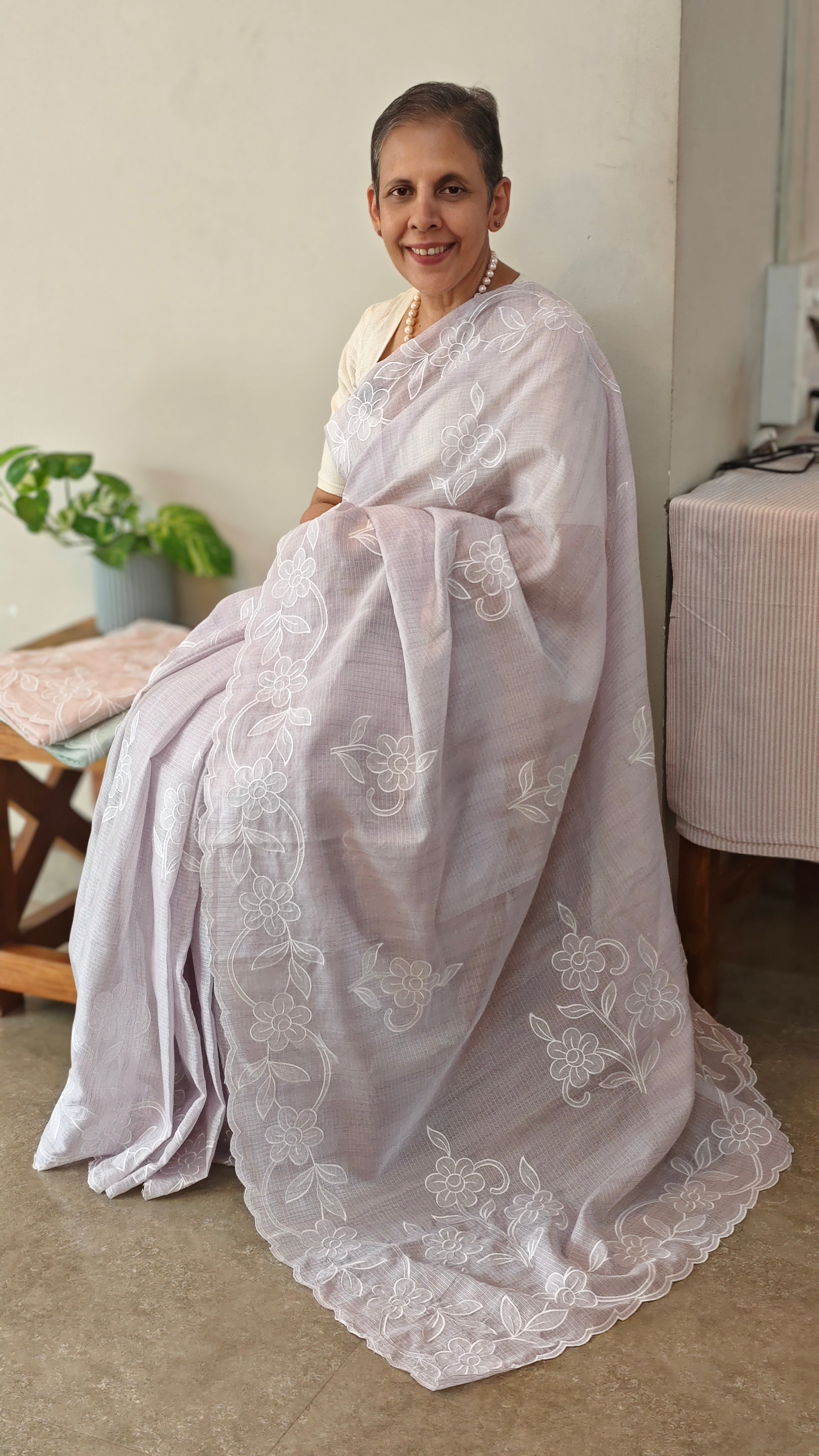 Pastel Silky kota saree with heavy applique embroidery along the borders and applique embroidered motifs spread all over the saree