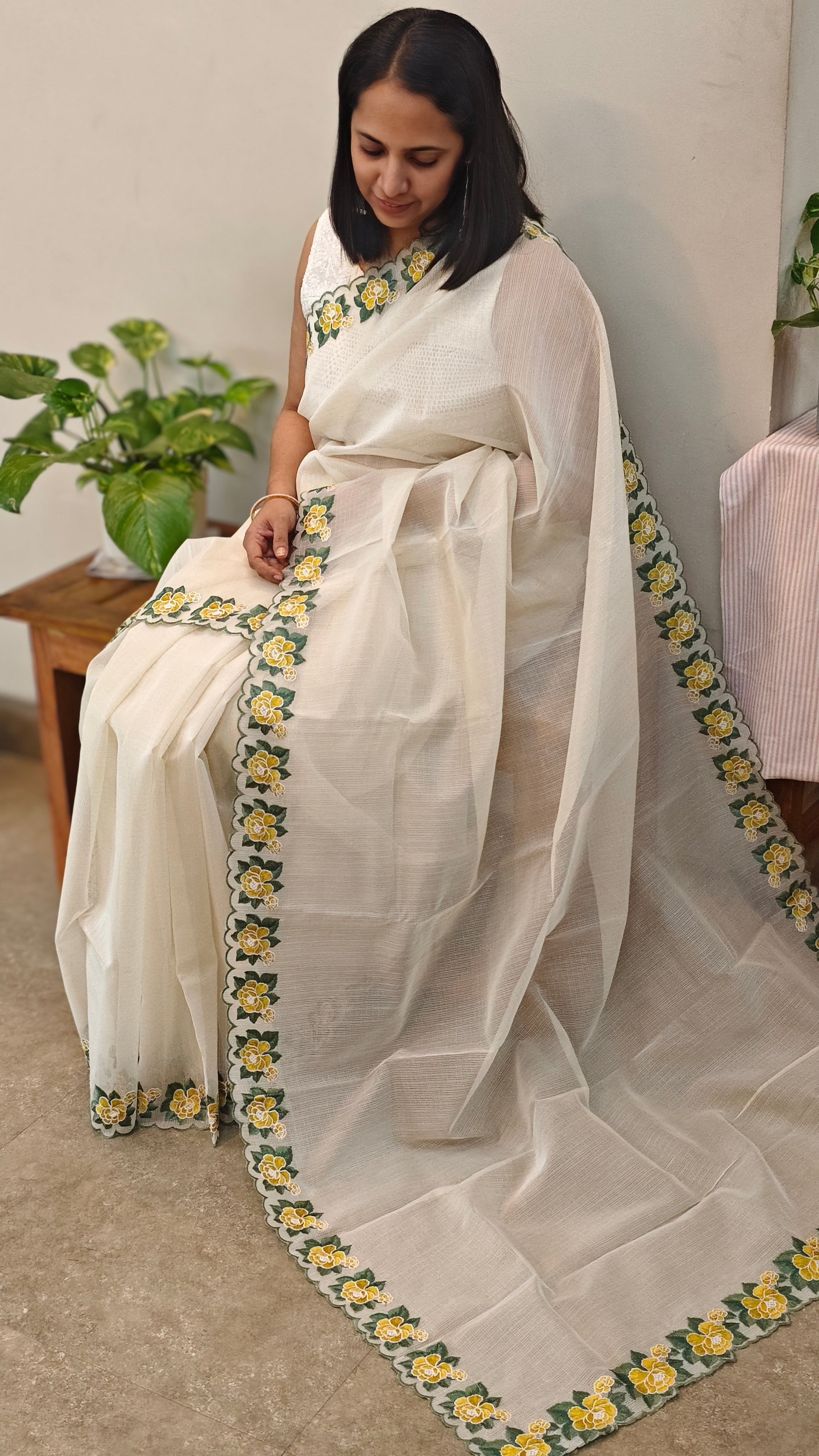 Net kota saree with floral embroidery along the borders