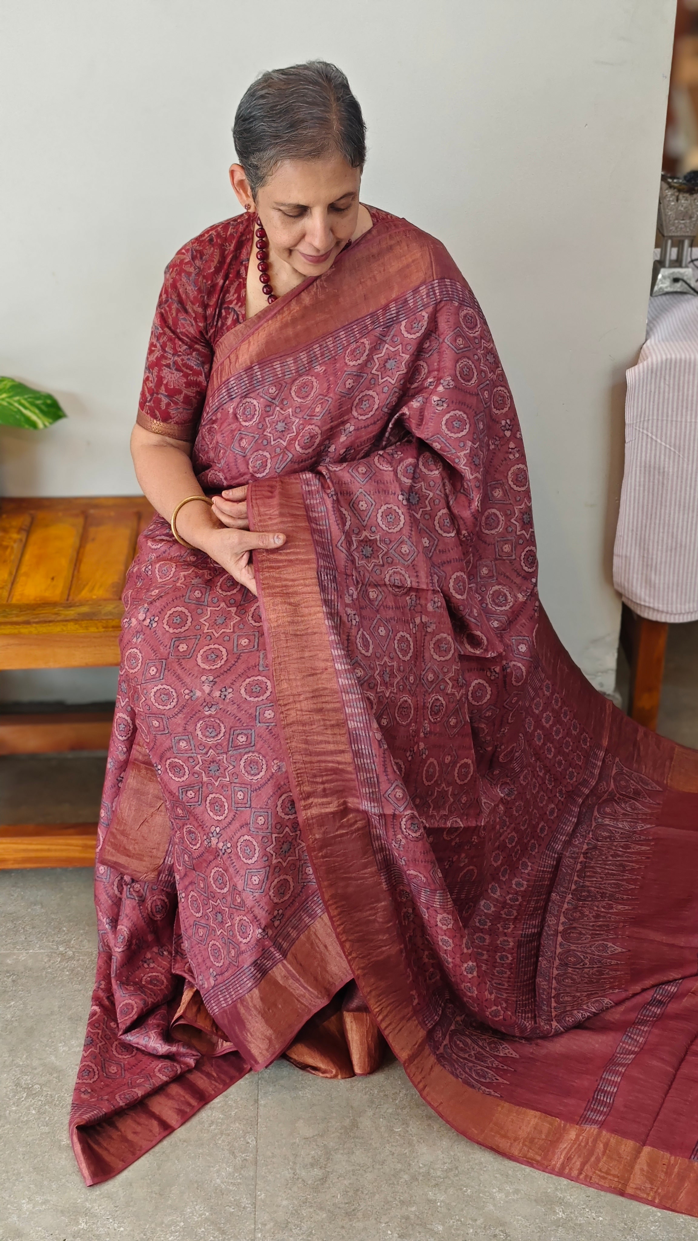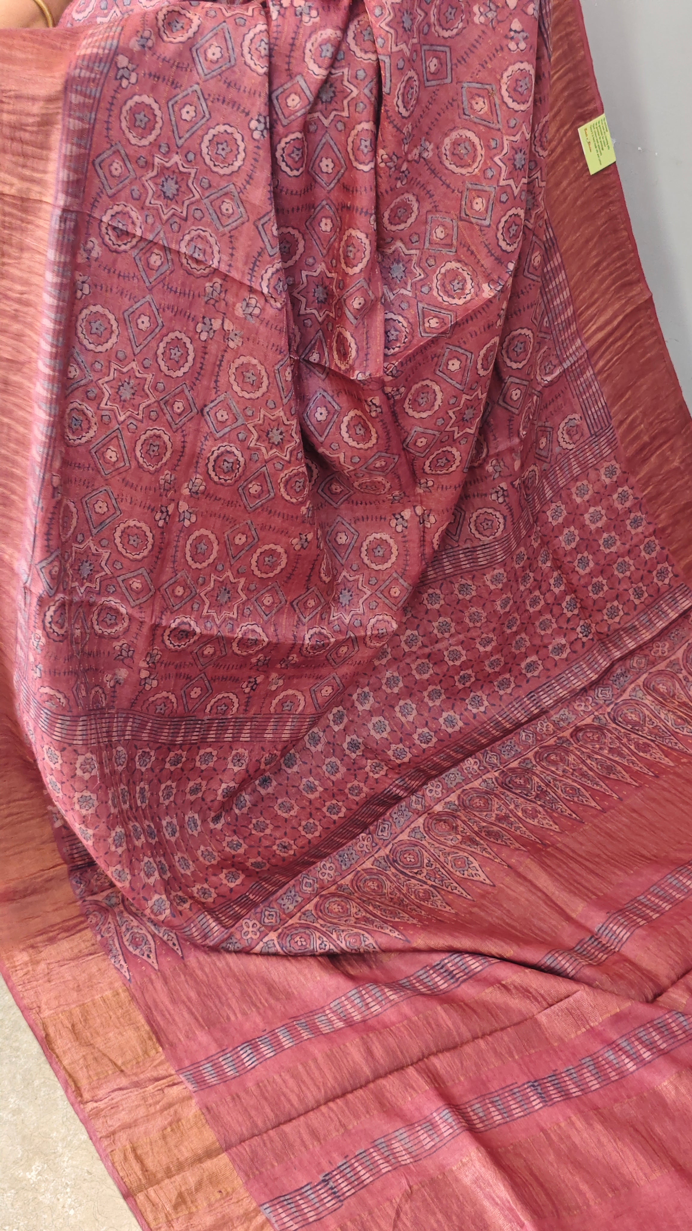 Rosewood pink ajrakh printed tussar silk saree - SB01