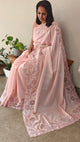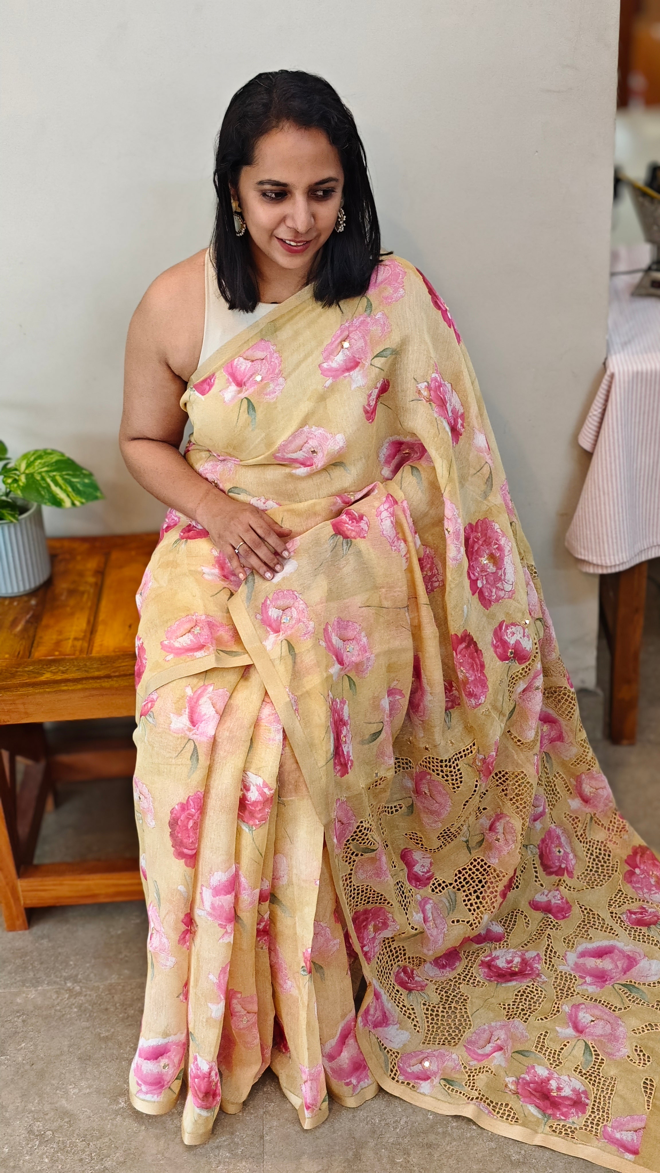 Floral printed linen chanderi saree with cutwork embroidery on pallu