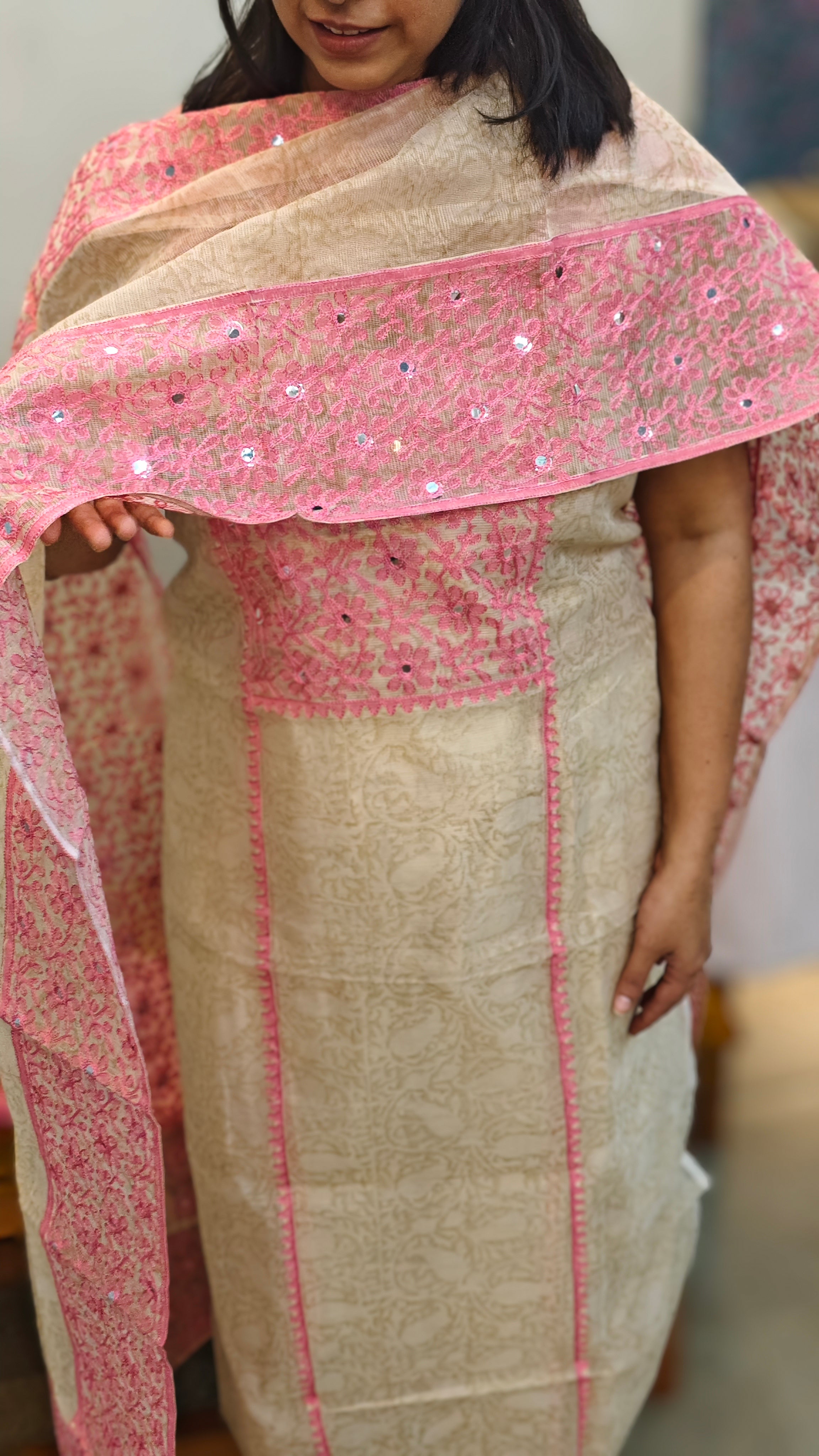 beige and pink net kota suit