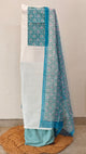 Blue cotton suit with embroidered yoke paired with green block printed net kota dupatta