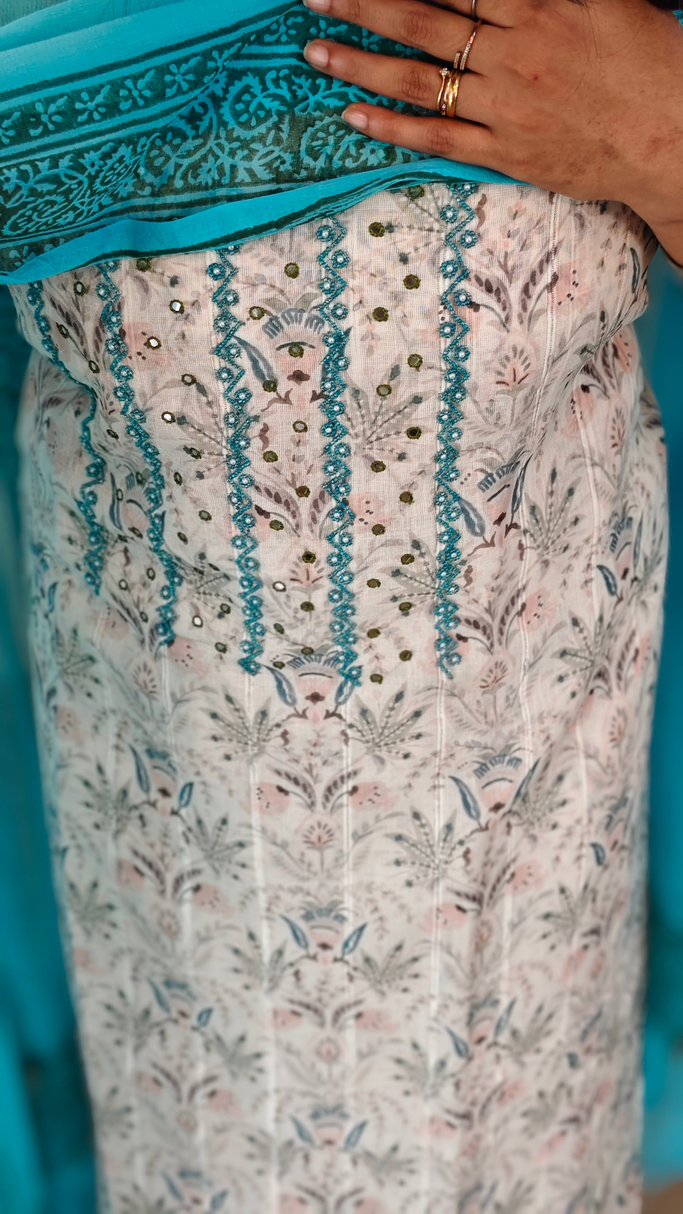 Linen cotton printed suit with bead work on yoke