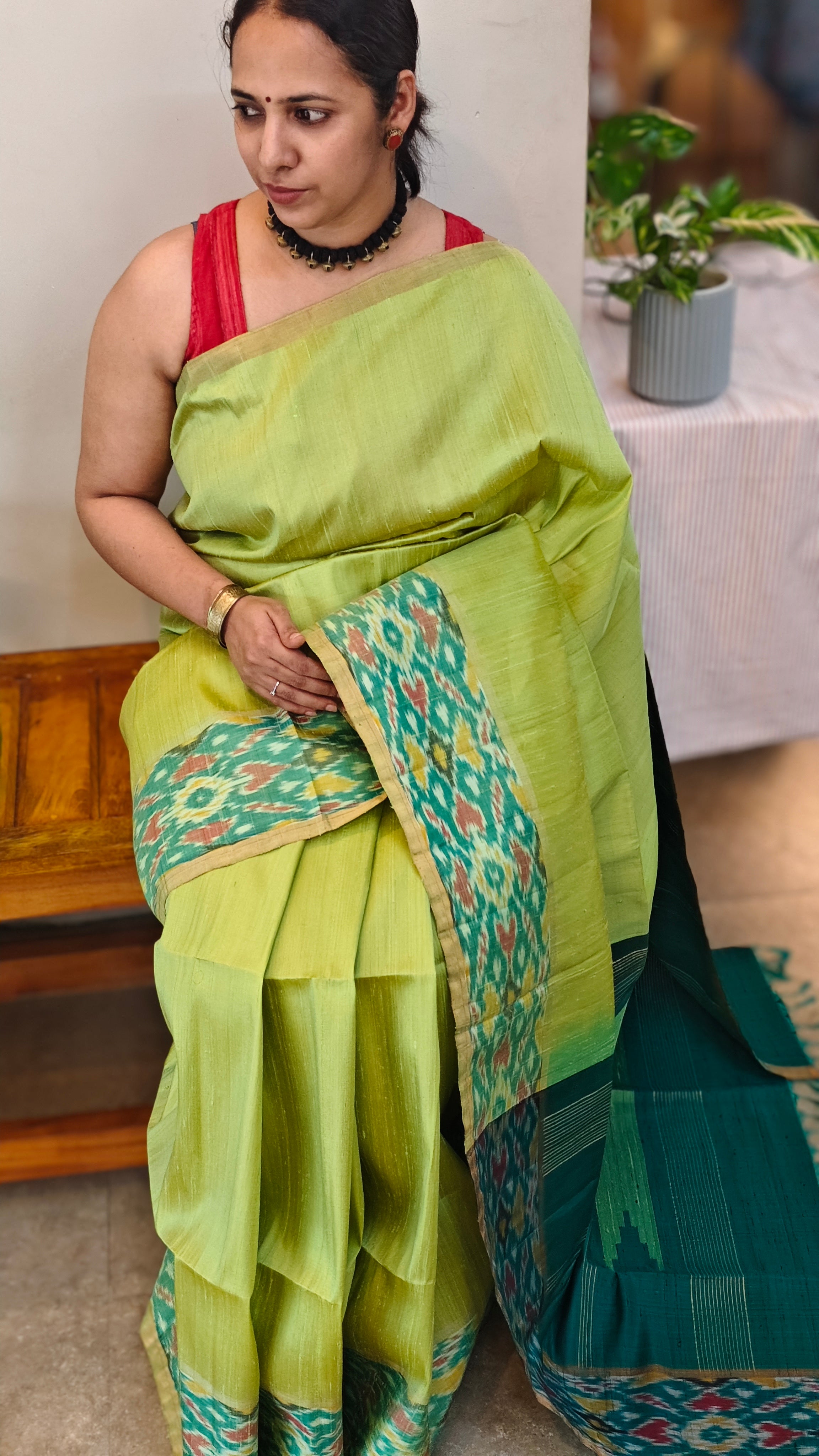 Pure handloom raw silk saree with ikat borders and contrast blouse piece