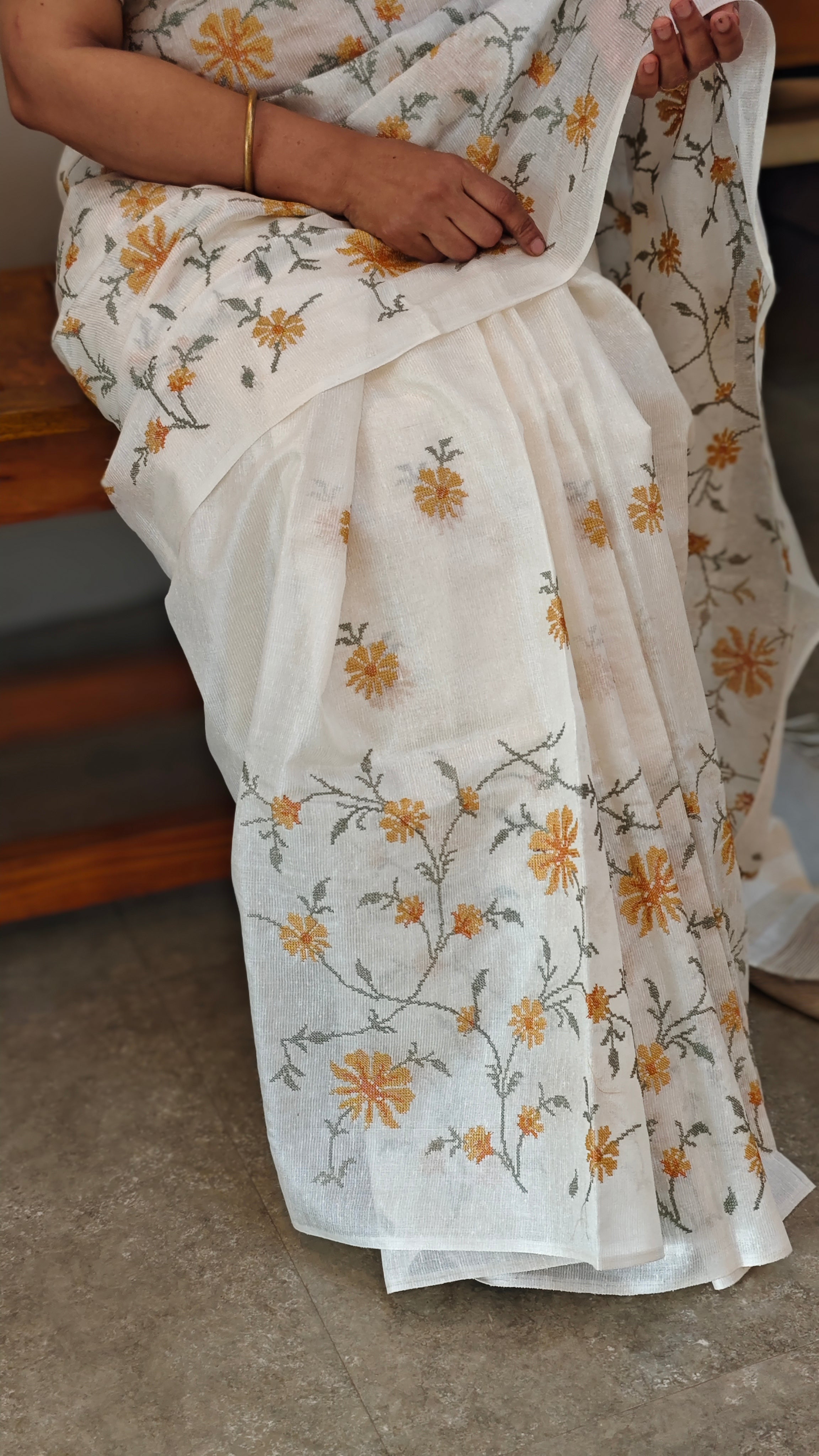 Mustard floral cross stitch embroidery on off white tussar silk saree - CST24
